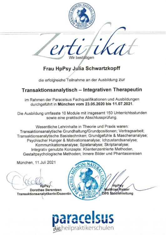 Ich arbeite als Heilpraktikerin für Psychotherapie und nutze eine integrative Herangehensweise. Dabei verwende ich Methoden aus der Transaktionsanalyse von Eric Berne, der Gestalttherapie von Frederick S. Perls und der Akzeptanz- und Commitment-Therapie (ACT).